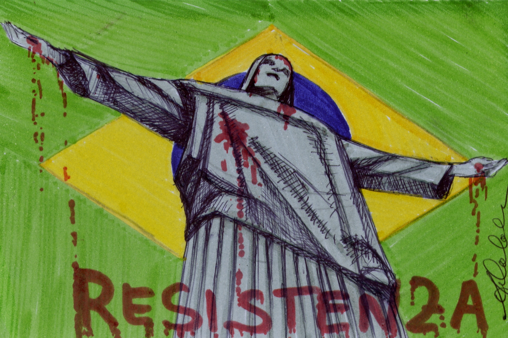 Antonia Calabrese, M.A. 4/2014, penna biro e pennarelli su cartoncino cm. 10 x 15, progetto Mail Art “1964-2014: 50 YEARS OF ART AGAINST THE STATE” per il 50 ° anniversario del colpo di stato militare in Brasile, contro la repressione e per la resistenza poetica, organizzato da Coletivo 308 e Ecatú Ateliê, Brasile.