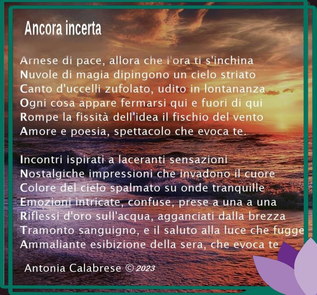 Un viaggio tra versi e immagini evocative: leggi una selezione di poesie tratte dai miei libri, pensate per regalarti un’anteprima autentica del mio stile e della mia scrittura. Ogni poesia è un frammento di emozione, un invito a fermarsi e riflettere, a lasciarsi trasportare dal ritmo delle parole.