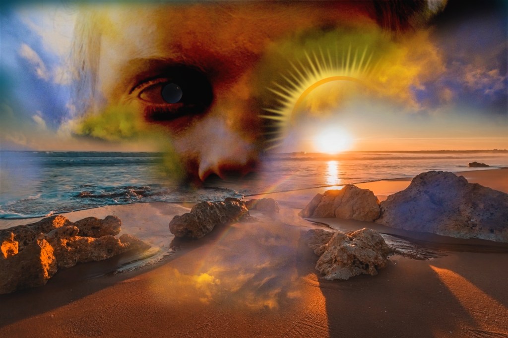 La composizione si sviluppa attraverso la fusione di due registri visivi distinti ma profondamente interconnessi: da un lato il paesaggio naturale, rappresentato da una spiaggia al tramonto con rocce e mare calmo; dall’altro il volto umano, in particolare lo sguardo di un bambino, che emerge e si sovrappone alla dimensione celeste dell’immagine.